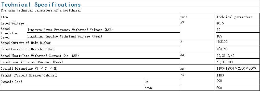 The main switch uses the ZN85-40.5 series vacuum circuit breaker, which features long service life, high breaking capacity, high enclosure protection, excellent insulation, safe and reliable operation, and convenient maintenance. The switchgear also incorporates a “five-proof” design.
